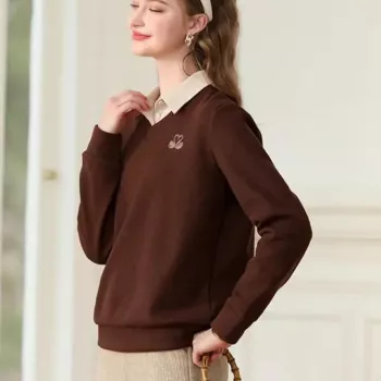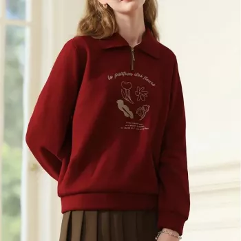 Women’s Embroidered Polo Collar Pullover Hoodie – Casual Loose Fleece Sweatshirt