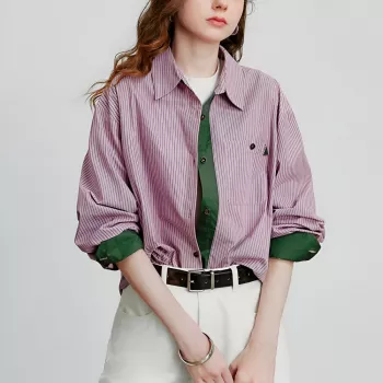 Women’s Retro Cotton Striped Shirt – Contrast Splice Button Down Fall Top