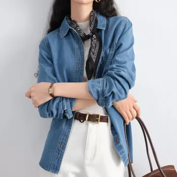 Petite Denim Blue Straight Shoulder Long Sleeve Shirt for Women – Casual Fall Top