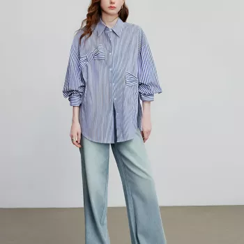 Women’s Striped Bowknot Blouse with Denim Patchwork and Long Sleeves